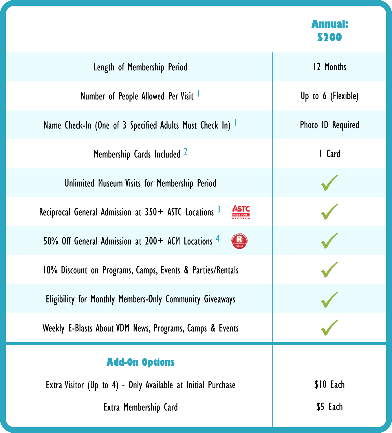 Annual memberships allow up to 6 people per visit to the Museum. Members must specify one Named Primary Adult and up to two additional Named Adult Caregivers. At least ONE of these three Named Adults must be present during all VDM visits and check in with their photo ID, but all remaining accompanying visitors are flexible up to the total number of spots on the membership. Up to 4 extra visitor spots may be added to the membership for $10 each, but this must be done at the time of initial purchase.